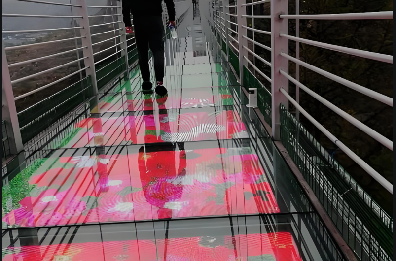 隨著旅游產(chǎn)業(yè)的蓬勃發(fā)展,景區(qū)之間的競(jìng)爭(zhēng)已從自然景觀延伸至技術(shù)創(chuàng)新體驗(yàn)。近年來,玻璃棧道因其驚險(xiǎn)刺激的特性成為眾多景區(qū)的“標(biāo)配”設(shè)施,而其中LED顯示屏技術(shù)的融合應(yīng)用,更將這一體驗(yàn)推向新高度。通過透明顯示、雷達(dá)感應(yīng)與音效系統(tǒng)的整合,玻璃棧道從單純的觀景平臺(tái)轉(zhuǎn)型為沉浸式互動(dòng)體驗(yàn)空間,不僅極大提升游客參與感,也為景區(qū)運(yùn)營(yíng)開辟了全新商業(yè)模式。