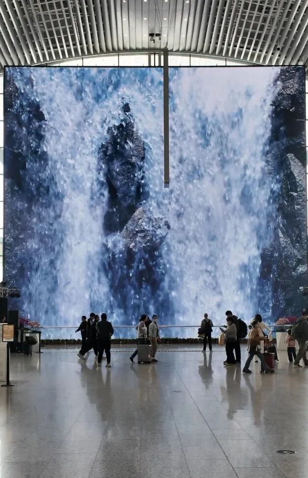 作為整場展演的開篇與收尾,利亞德勵豐文化通過裸眼3D技術(shù)打造的《水景瀑布》構(gòu)建出極具沉浸感的數(shù)字山水空間。潺潺流水從33米高的巨幕上奔涌而下,旅客在航站樓內(nèi)也能身臨其境地感受嶺南山水的秀美與靈性,實現(xiàn)了科技與自然的詩意融合。